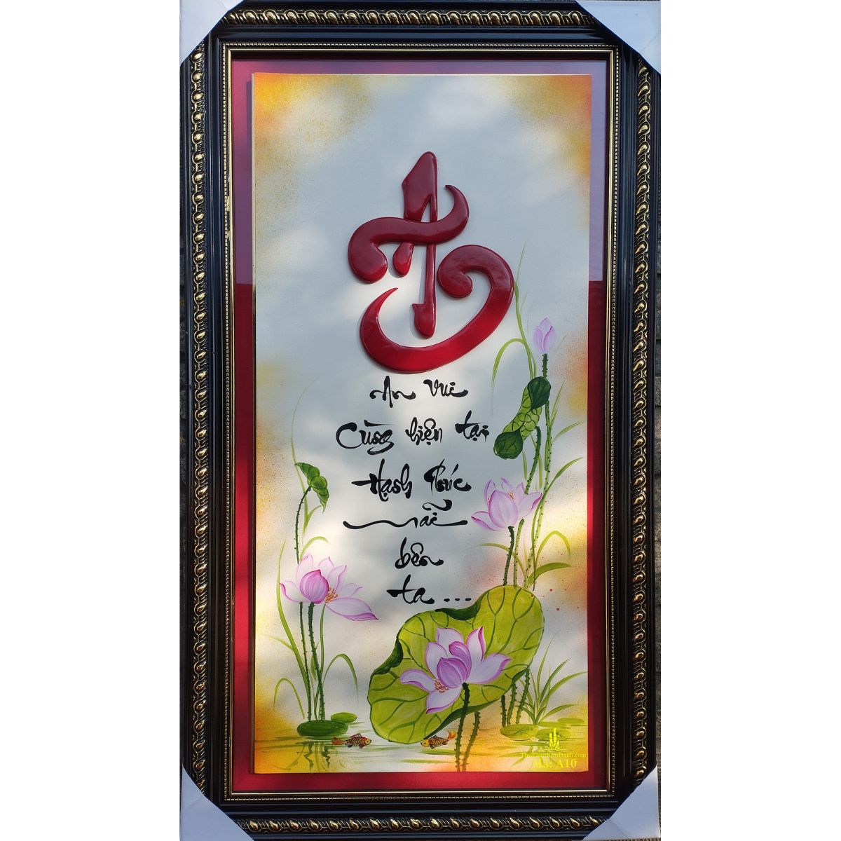 Bức tranh kết hợp giữa thư pháp và hình ảnh hoa sen – một biểu tượng quen thuộc của sự thanh cao, thuần khiết. Hoa sen vươn lên từ bùn nhưng không nhiễm bẩn, giống như con người giữ được tâm an giữa cuộc đời nhiều biến động.