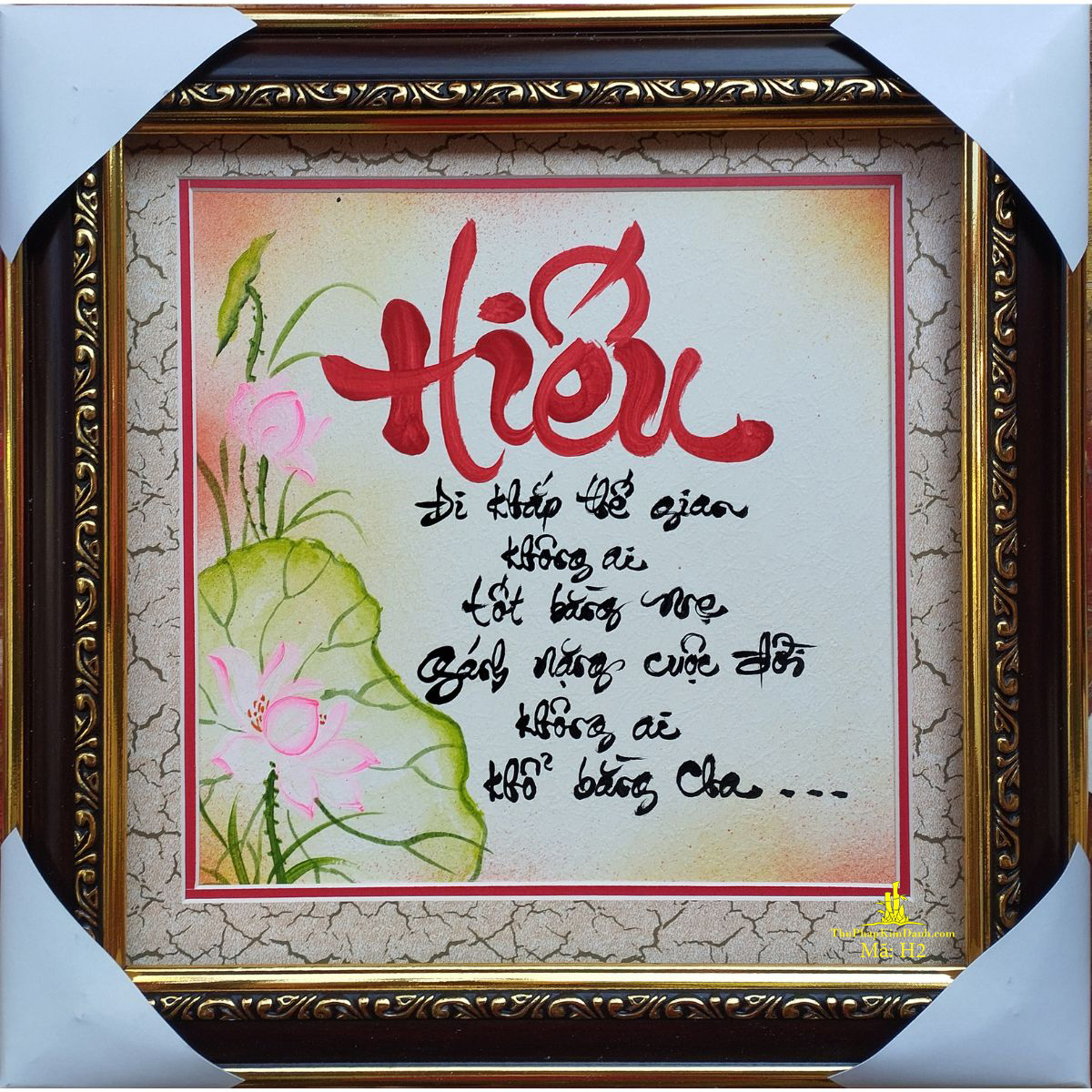 Chữ Hiếu trong bức tranh được viết bằng nét thư pháp lớn, mềm mại mà chắc khỏe, thể hiện tình cảm sâu nặng nhưng bền bỉ, không phô trương mà thấm dần vào lòng người – đúng với bản chất của lòng hiếu thảo.