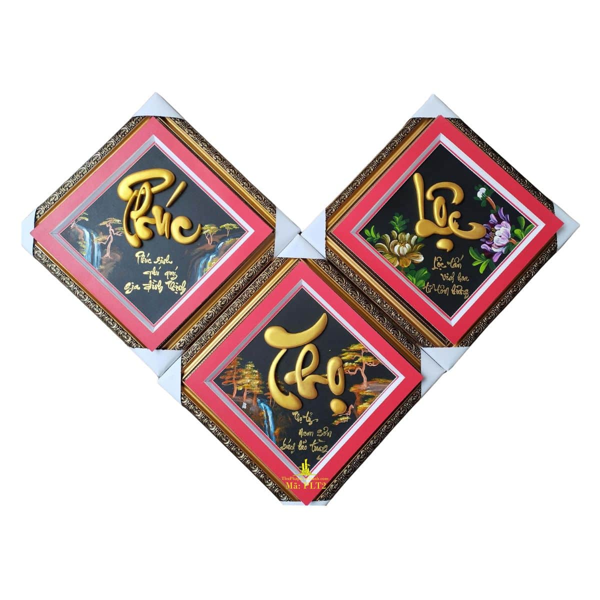 - Bố cục dạng thoi (diamond) với chữ đặt ở trung tâm mỗi khung tạo nhịp mắt mạnh, dễ thu hút. Ba bức tranh liên kết với nhau thể hiện sự cân bằng: phúc – lộc – thọ bổ trợ nhau.